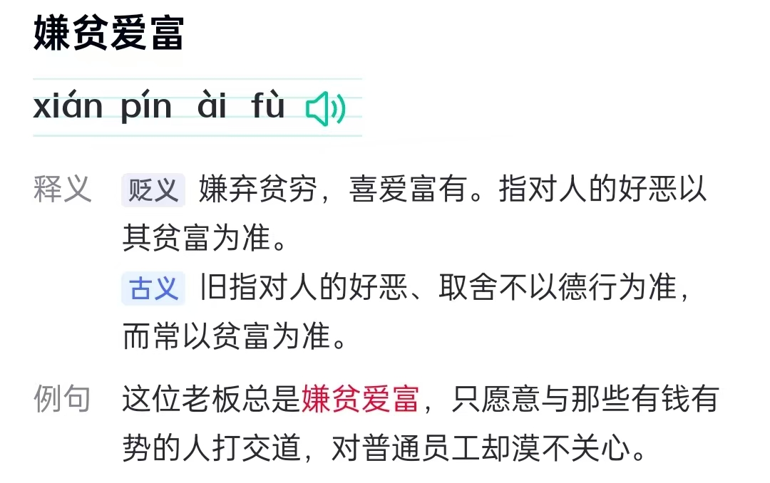 嫌贫爱富,看站在那边讲这句话,站在富人角度,就是看不起穷人,站在穷人角度就是仇富