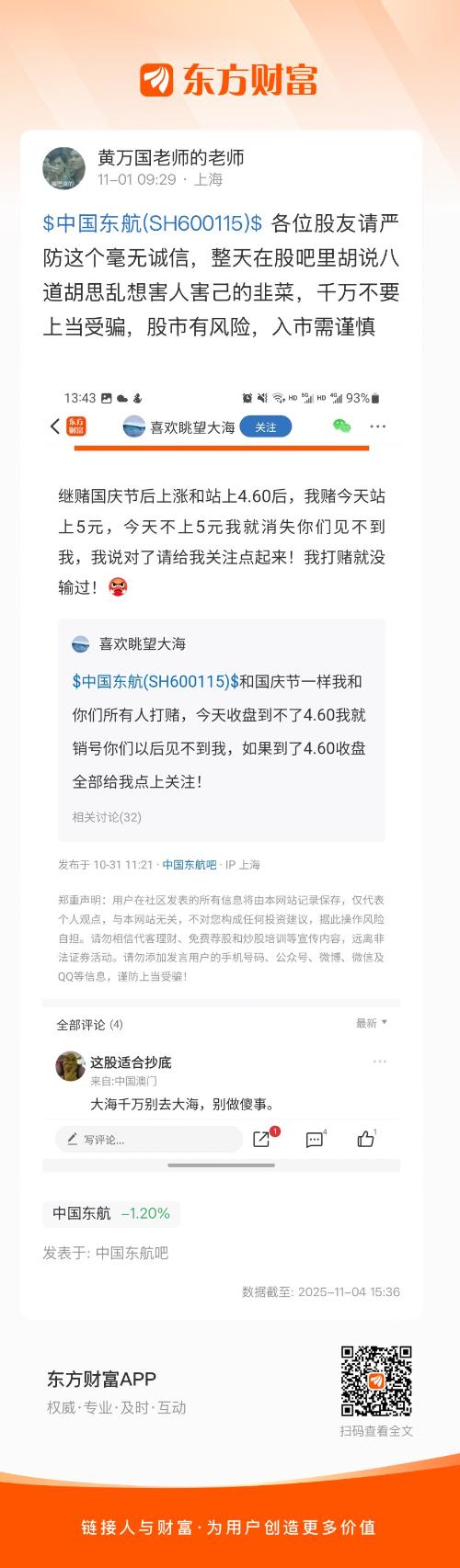 $中国东航(SH600115)$ 各位股友请严防这个毫无诚信,整天在股吧里胡说八道胡思乱想害人害己的韭菜,千万不要上当受骗,股市有风险,入市需谨慎