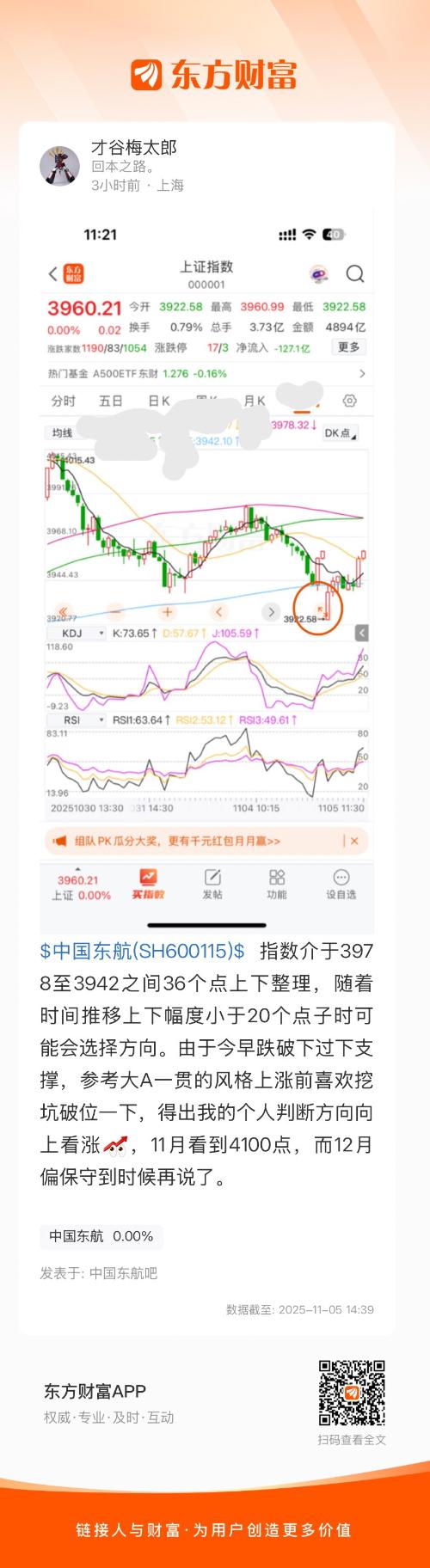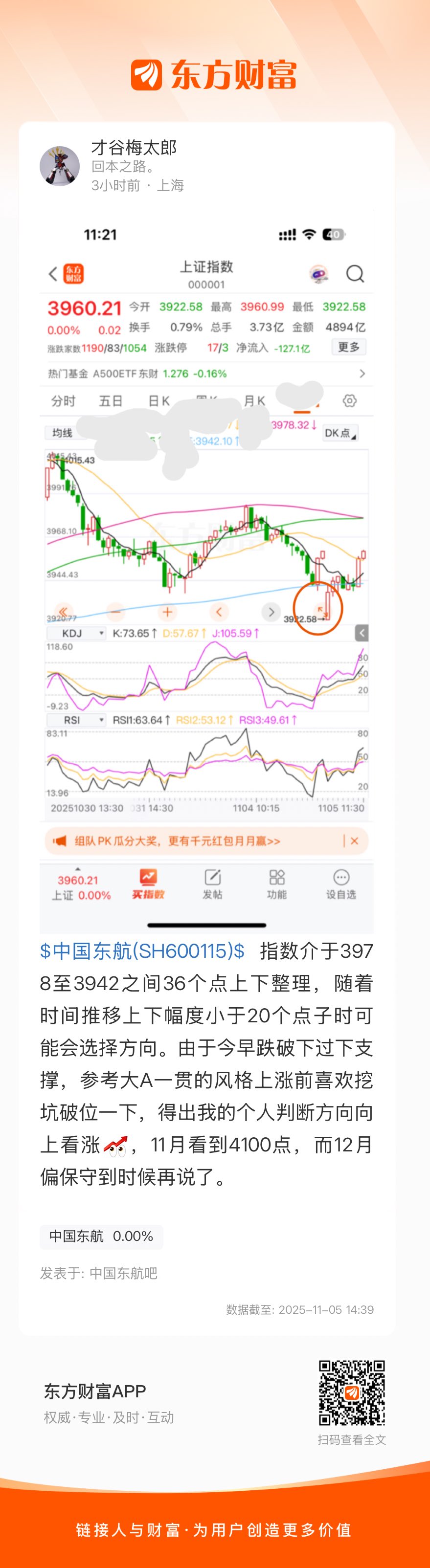 $中国东航(SH600115)$ 指数介于3978至3942之间36个点上下整理,随着时间推移上下幅度小于20个点子时可能会选择方向。由于今早跌破下过下支撑,参考大A一贯的风格上涨前喜欢挖坑破位一下,得出我的个人判断方向向上看涨