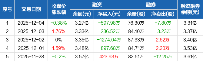 融资方面,当日融资买入1515.29万元,融资偿还2113.27万元,融资净偿还597.98万元,连续4日净偿还累计3006.22万元。融券方面,融券卖出9.79万股,融券偿还17.59万股,融券余量76.3万股,融券余额396万元。融资融券余额合计3.31亿元。