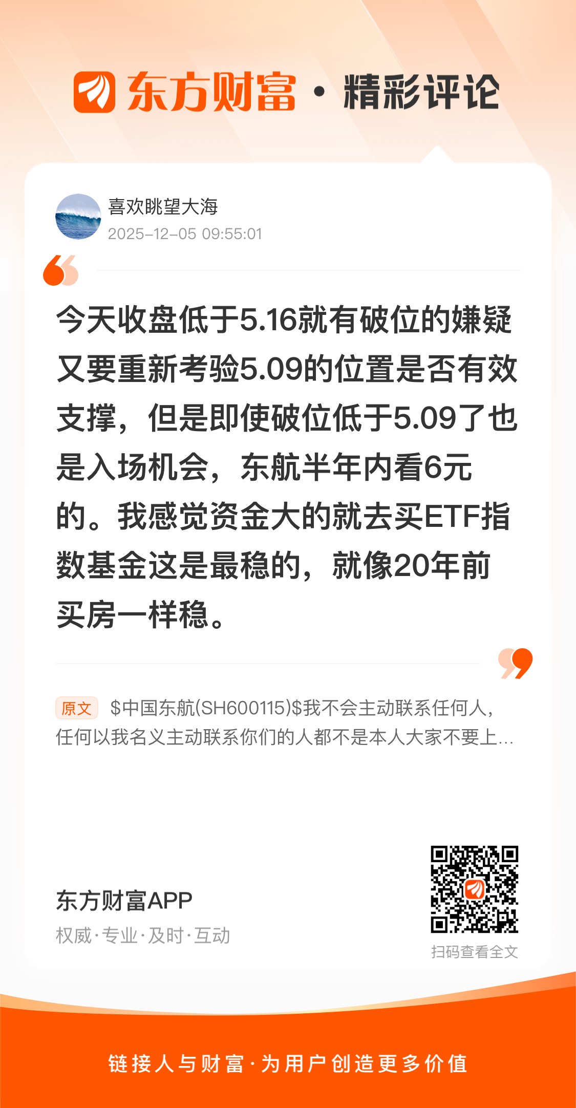 就算破了5.09也是意料之中,但是6元是意料之内的事,确定性无比之高。//@喜欢眺望大海 : 今天收盘低于5.16就有破位的嫌疑又要重新考验5.09的位置是否有效支撑,但是即使破位低于5.09了也是入场机会,东航半年内看6元的。我感觉资金大的就去买ETF指数基金这是最稳的,就像20年前买房一样稳。