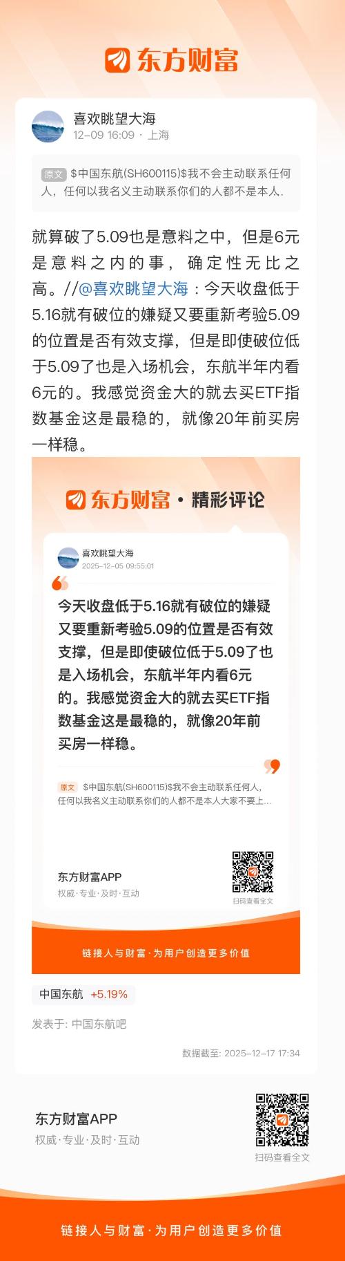 就算破了5.09也是意料之中,但是6元是意料之内的事,确定性无比之高。//@喜欢眺望大海 : 今天收盘低于5.16就有破位的嫌疑又要重新考验5.09的位置是否有效支撑,但是即使破位低于5.09了也是入场机会,东航半年内看6元的。我感觉资金大的就去买ETF指数基金这是最稳的,就像20年前买房一样稳。