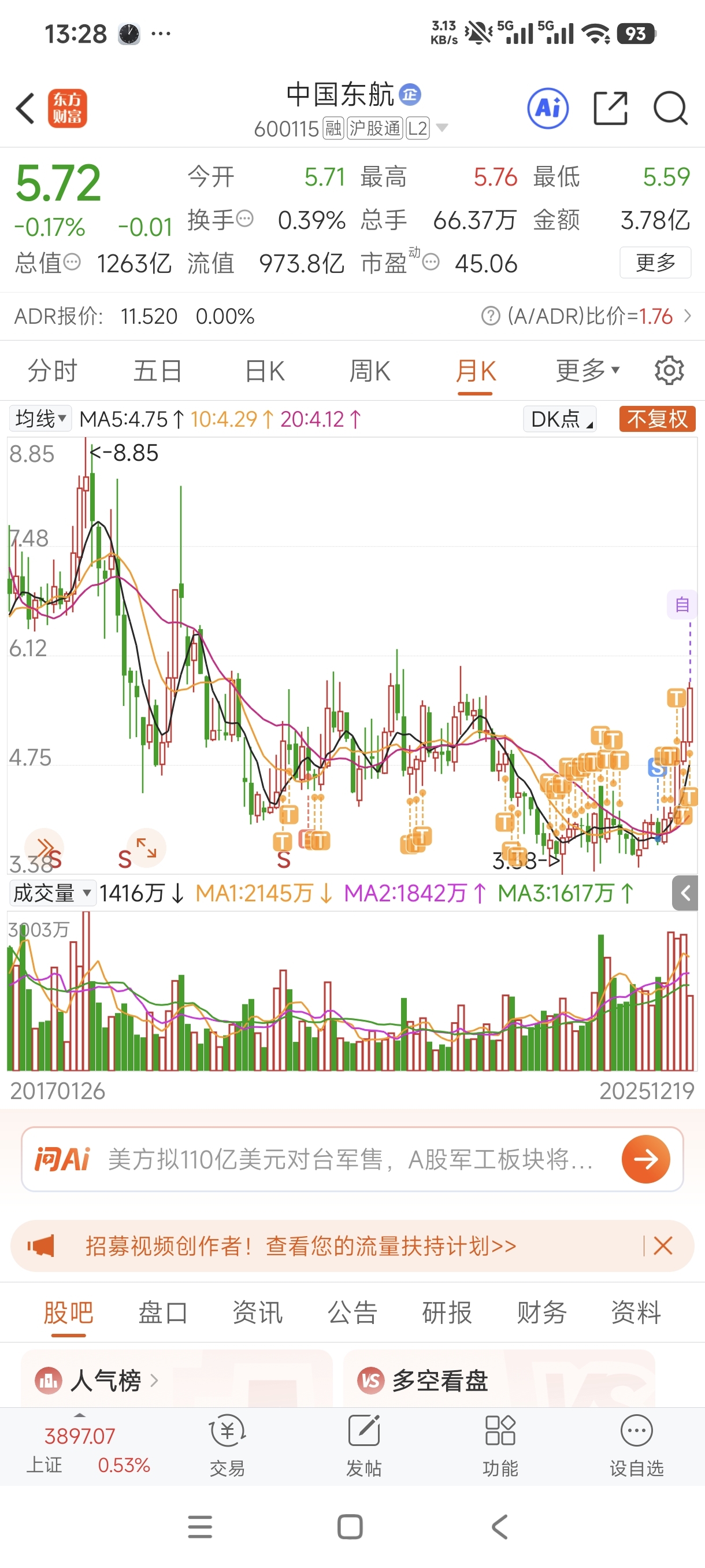 $中国东航(SH600115)$ 月线五连阳,极其罕见。大概率1月份月线也是阳线