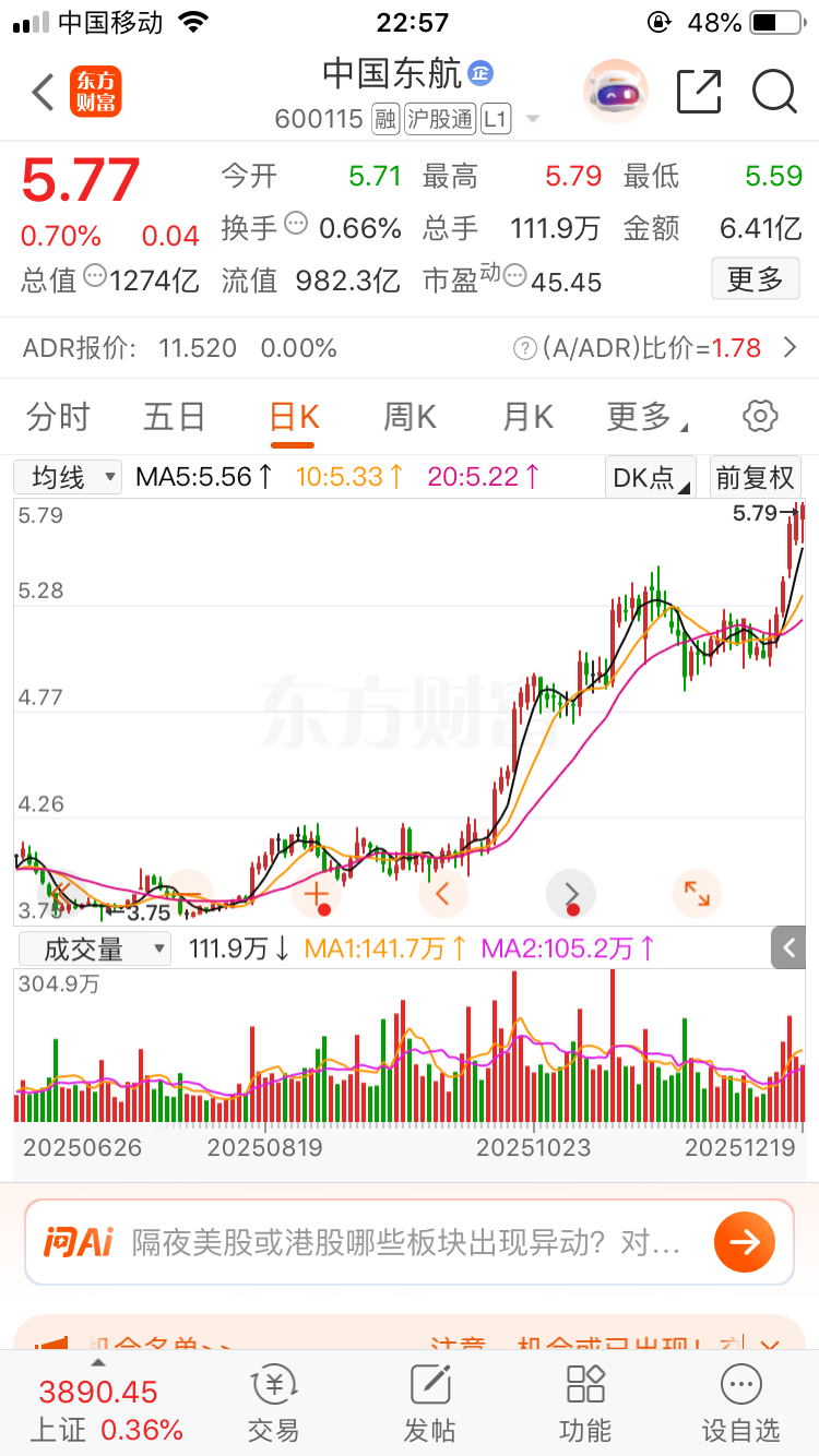 $中国东航(SH600115)$ 完全可以放开防守,大胆去做,中国东航站稳6元见8元,水涨船高标的,这是大消费股,也是核心标的,飞起来也是需要技术的,风控也很严格,别的公司涨飞天了,它的迟早也会飞起来,看趋势应该是机构抱团标的,耐心资本运作,盯住它,看长做短,跌买涨卖。