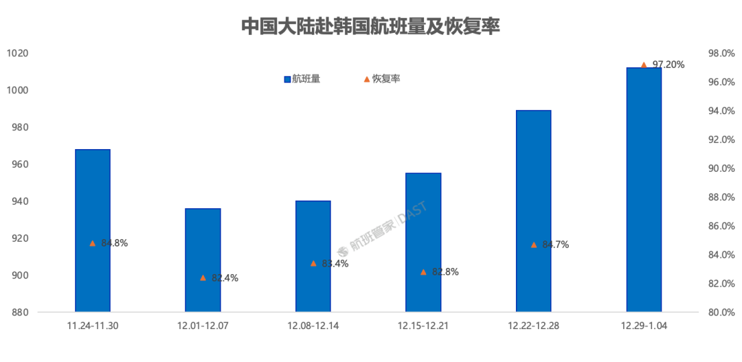 航班管家DAST数据显示,中国内地赴韩国航线周航班量已连续4周增长。其中,2026年第1周(2025年12月29日至2026年1月4日),中国内地赴韩国航班量突破1000班次,达1012班次,居国际航线首位,恢复至2019年的97.2%。