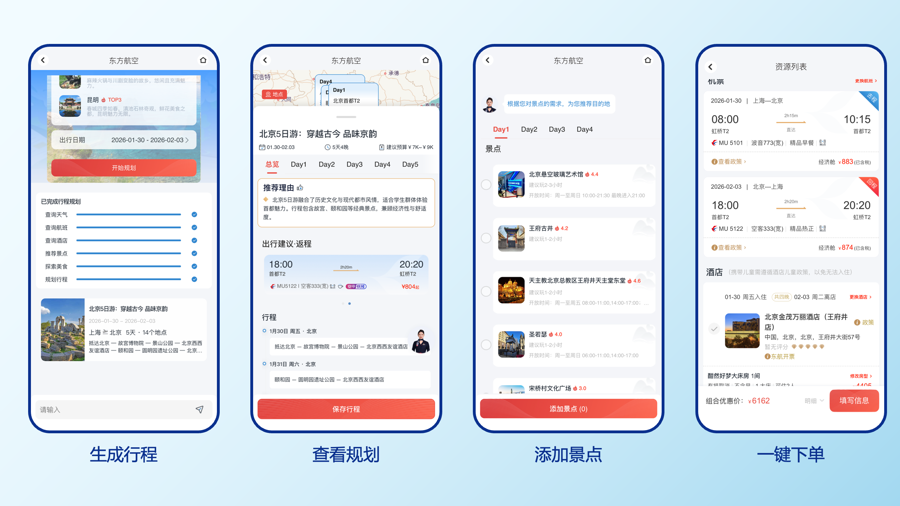 针对行程制订复杂、机票酒店分开预订等旅客出行常见问题,东航APP推出了“AI行程规划”功能,旅客只需用自然语言告知出发日期、出发地、目的地等需求,APP即可生成涵盖景点、美食推荐的个性化方案。若出行人包含儿童、老人等,APP还可根据亲子、银发出行场景进行针对性调整,去年已有超1000万旅客体验了该功能。东航APP同步新增了一键预订行程内机票、酒店等功能,方便旅客一次性完成操作。