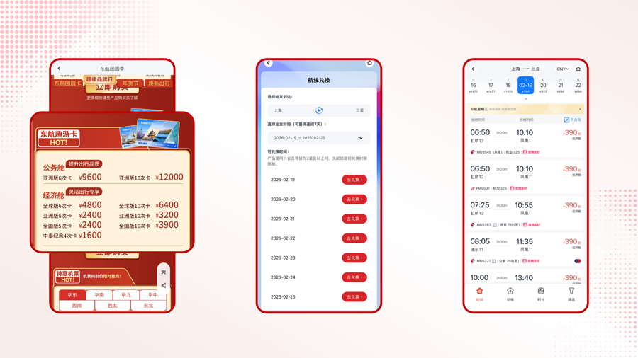 面对“史上最长春节假期”带来的探亲、出游、返校叠加需求,东航在APP及小程序推出“绮丽东方·新春团圆季”专区,汇聚多款高性价比出行产品。