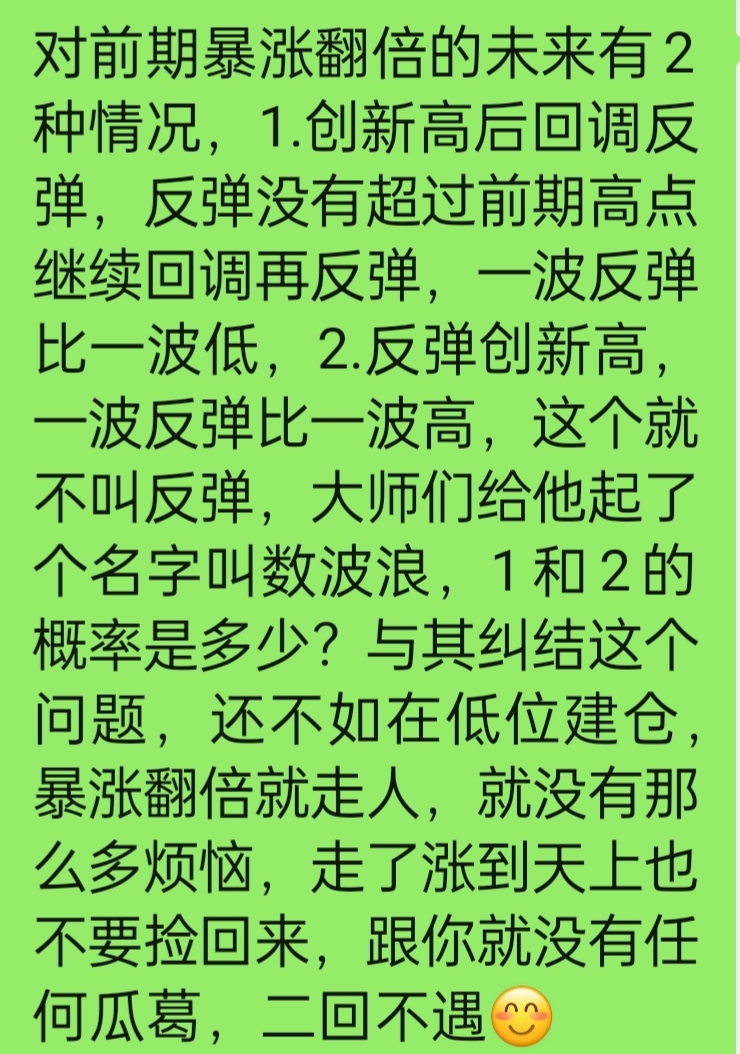 对前期暴涨翻倍的未来有2种情况,1.创新高后回调反弹,反弹没有超过前期高点继续回调再反弹,一波反弹比一波低,2.反弹创新高,一波反弹比一波高,这个就不叫反弹,大师们给他起了个名字叫数波浪,1和2的概率是多少?与其纠结这个问题,还不如在低位建仓,暴涨翻倍就走人,就没有那么多烦恼,走了涨到天上也不要捡回来,跟你就没有任何瓜葛,二回不遇