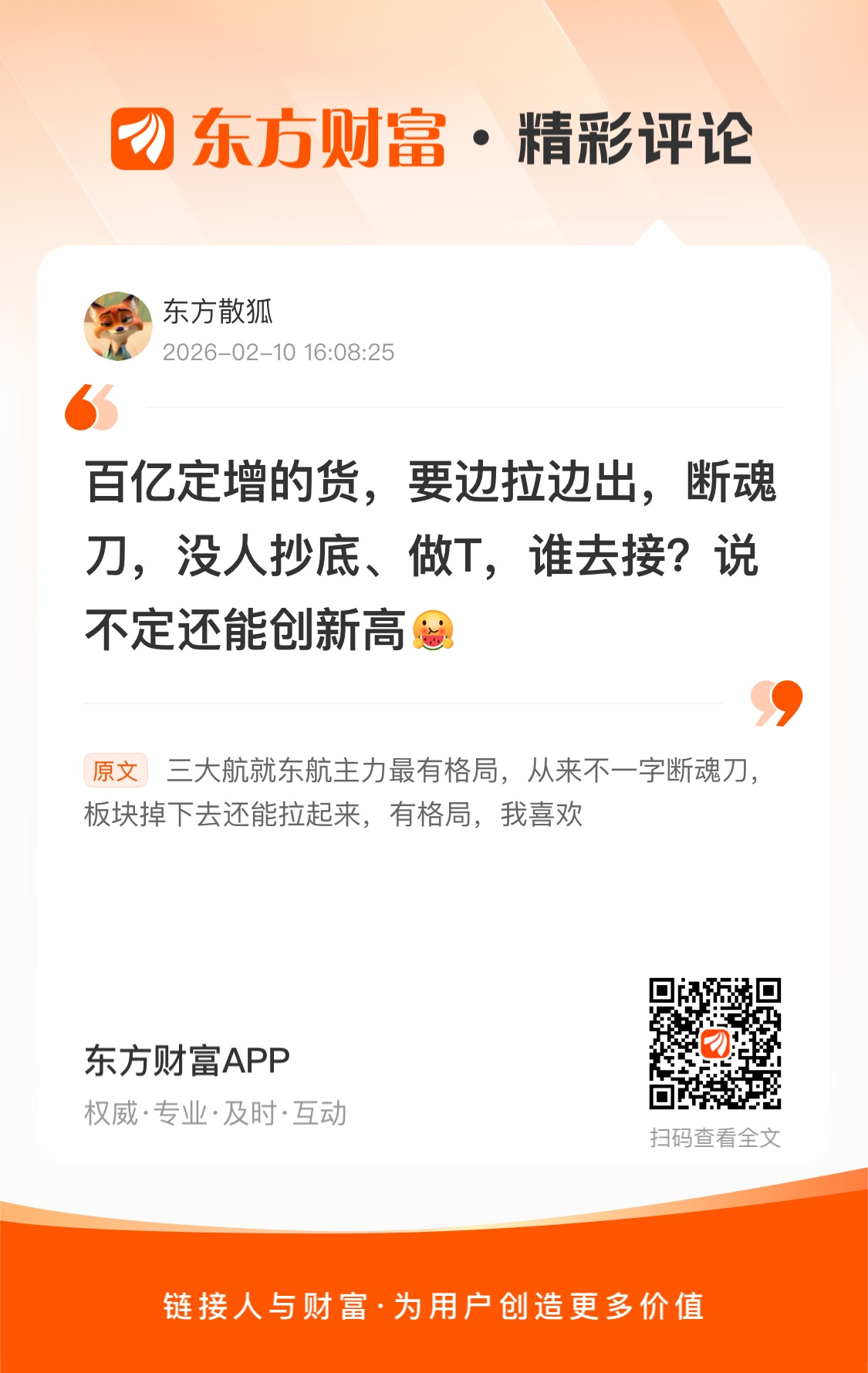 未来肯定还要定增,东航目标万亿市值成为世界的东航,东航的主场SH浦东机场也必将成为世界的中转站!燕雀安知鸿鹄之志。//@东方散狐 : 百亿定增的货,要边拉边出,断魂刀,没人抄底、做T,谁去接?说不定还能创新高