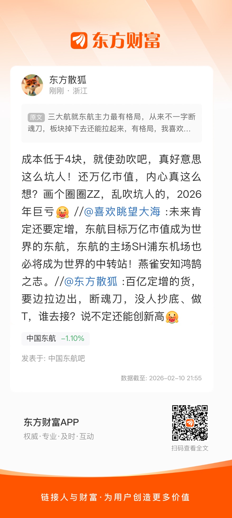 温馨提示: 1.根据《证券法》规定,禁止编造、传播虚假信息或者误导性信息,扰乱证券市场;2.用户在本社区发表的所有资料、言论等仅代表个人观点,与本网站立场无关,不对您构成任何投资建议。用户应基于自己的独立判断,自行决定证券投资并承担相应风险。《东方财富社区管理规定》