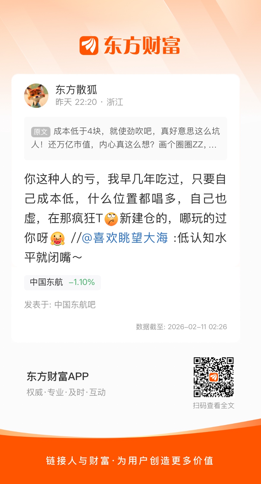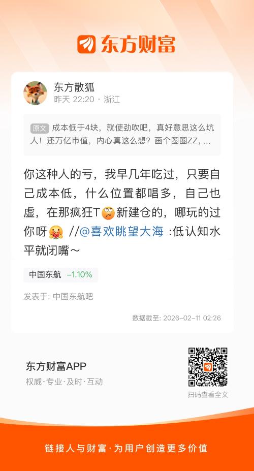 温馨提示: 1.根据《证券法》规定,禁止编造、传播虚假信息或者误导性信息,扰乱证券市场;2.用户在本社区发表的所有资料、言论等仅代表个人观点,与本网站立场无关,不对您构成任何投资建议。用户应基于自己的独立判断,自行决定证券投资并承担相应风险。《东方财富社区管理规定》