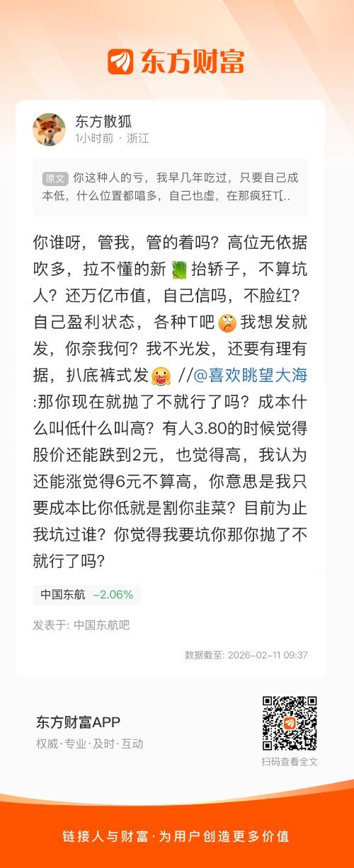 //@喜欢眺望大海 :那你现在就抛了不就行了吗?成本什么叫低什么叫高?有人3.80的时候觉得股价还能跌到2元,也觉得高,我认为还能涨觉得6元不算高,你意思是我只要成本比你低就是割你韭菜?目前为止我坑过谁?你觉得我要坑你那你抛了不就行了吗?