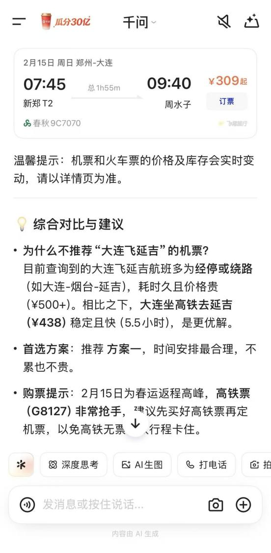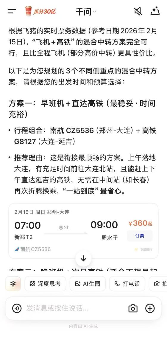 比如,当用户需要预订郑州去延吉的行程,其可以提供三到四个不同的出行方案,并在方案之后点评,哪些方案更具性价比,哪些方案更具时效性。当用户选择飞机转高铁方案时,其还会提醒,因春运期间火车票较为紧张,建议先预定成功大连到延吉的高铁后,再出郑州到大连的机票。同时,它们也将平台提供的折扣价、大额满减券也都考虑在内,帮用户算好折扣权益。