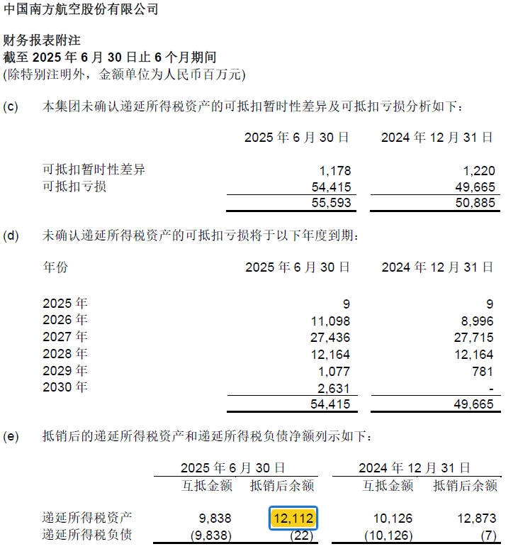 南航2026~2028年,可抵扣亏损集中到期;递延所得税资产,主要由它们产生,也基本同步。