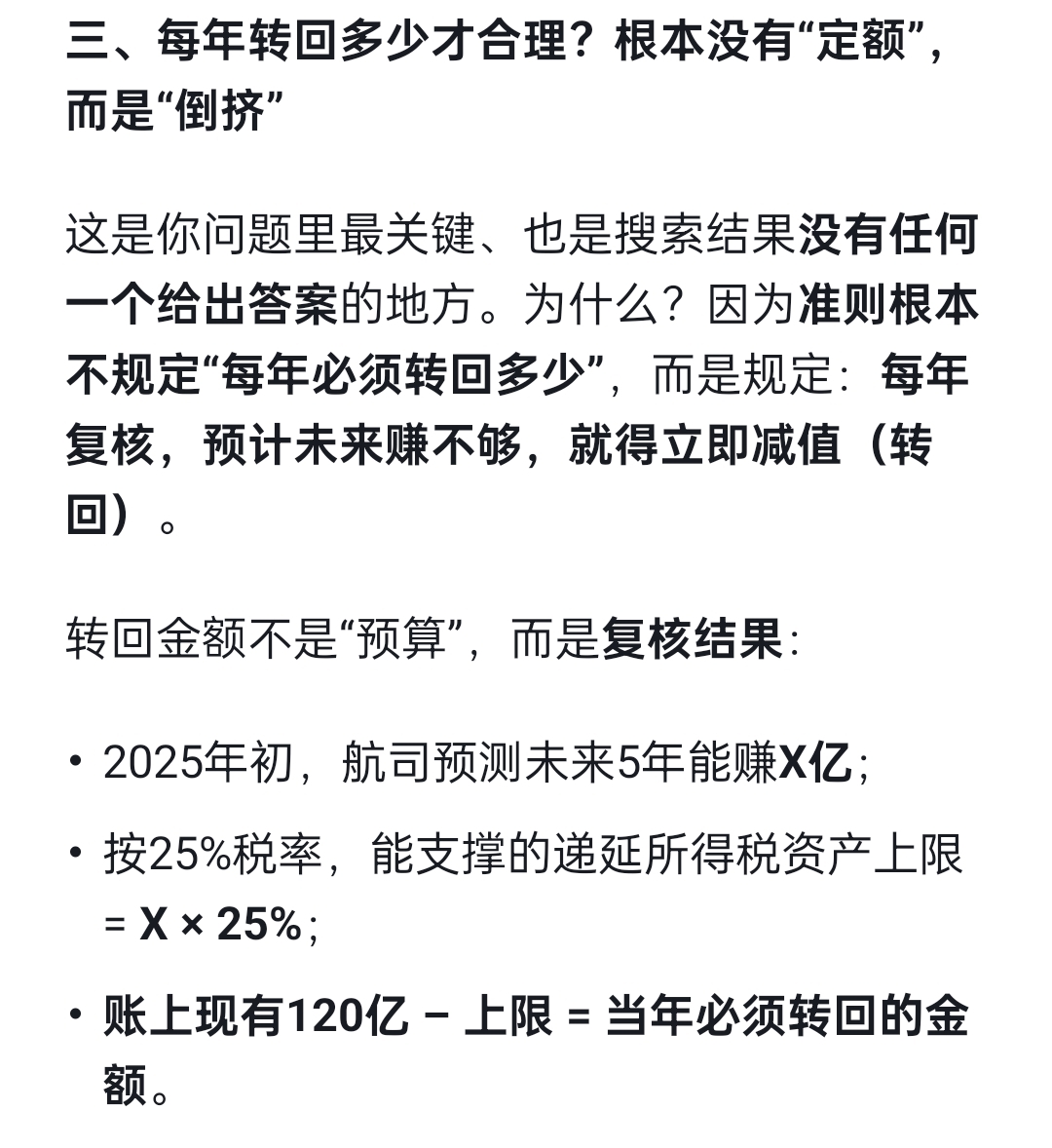 预估南航2026还剩100亿以上;平均到5年,每年20亿,25%的税率,需要用80亿的利润支撑;不管盈利如何,可抵扣亏损到期,也不得不转回!