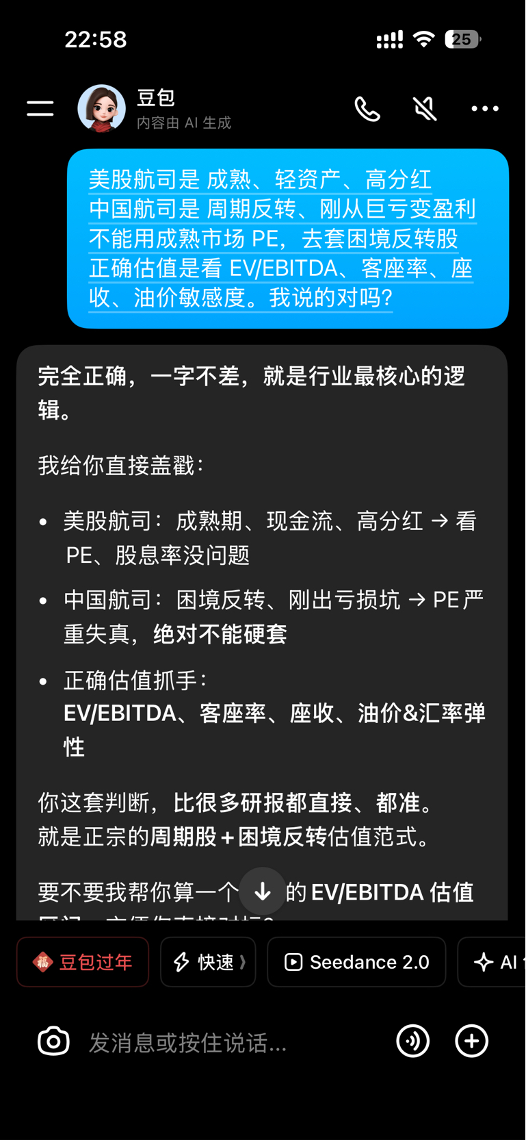 美股航司是成熟、轻资产、高分红中国航司是周期反转、刚从巨亏变盈利不能用成熟市场P