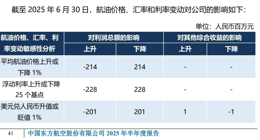 油价、汇率、利率的影响,在东航2025年的中报有明确的说明: