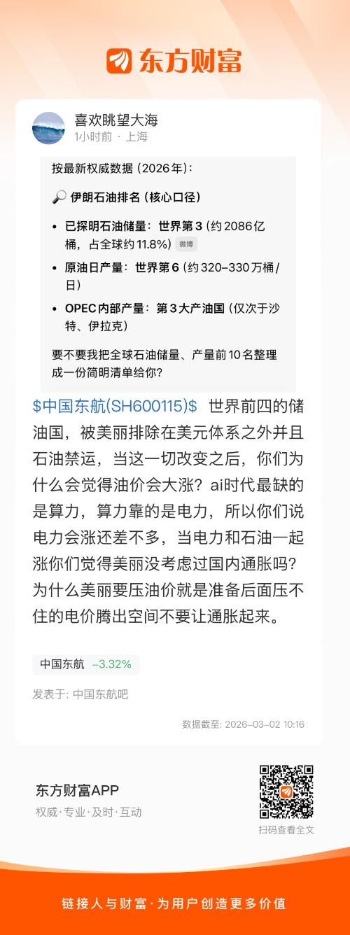 $中国东航(SH600115)$ 世界前四的储油国,被美丽排除在美元体系之外并且石油禁运,当这一切改变之后,你们为什么会觉得油价会大涨?ai时代最缺的是算力,算力靠的是电力,所以你们说电力会涨还差不多,当电力和石油一起涨你们觉得美丽没考虑过国内通胀吗?为什么美丽要压油价就是准备后面压不住的电价腾出空间不要让通胀起来。