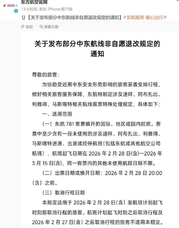 针对当前的突发局势,国内国航、东航、南航、海航等航司已发布免费退改签政策,主要针对2月28日至3月15日,迪拜、阿布扎比、利雅得、德黑兰、多哈等地进出港(含经停)的航班。