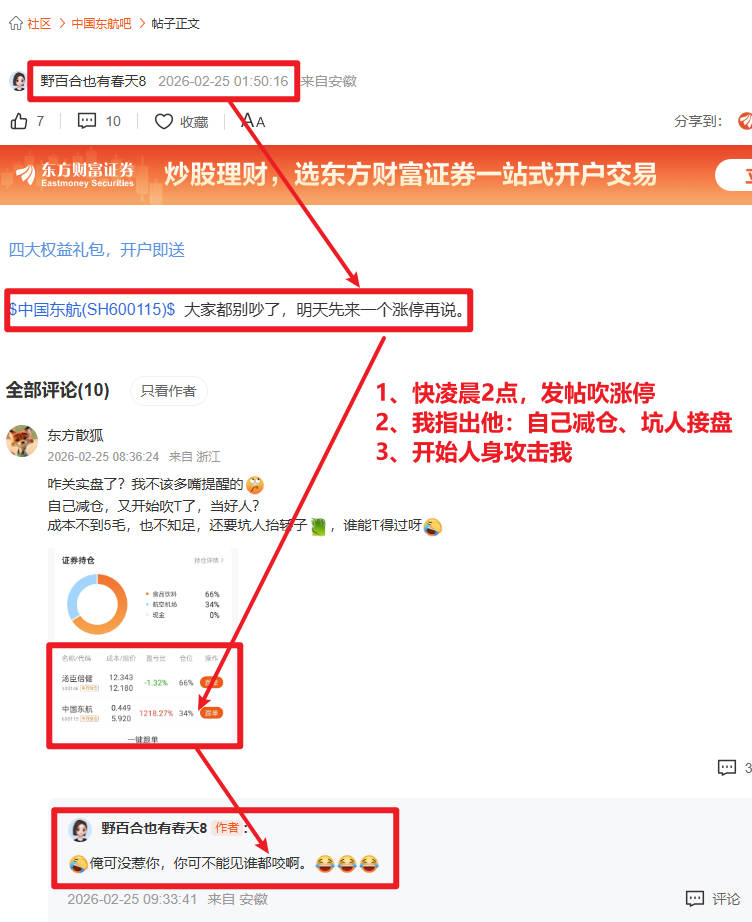 3、你们以为他真的多看好东航、不知道风险?不不不,2.13东航仓位就不重了,可能涨停前就跑了…你们爱截图挂人,我也会;还好我有历史图