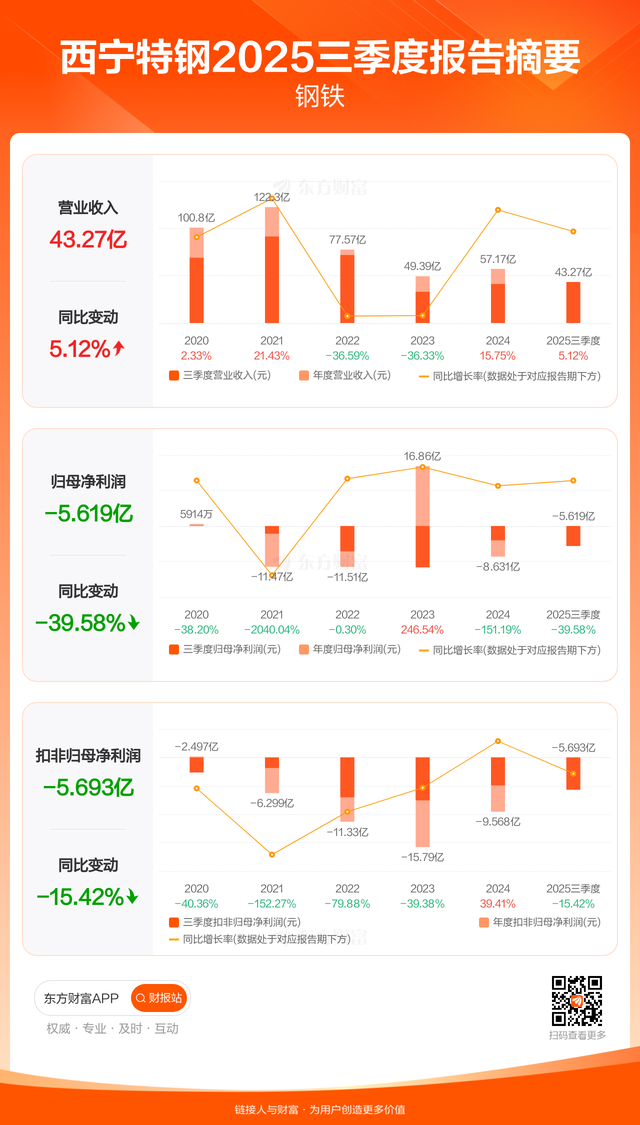西宁特钢10月31日发布2025年三季报显示,公司前三季实现营业收入43.27亿元,同比增长5.12%;归母净利润-5.62亿元;扣非归母净利润-5.69亿元。