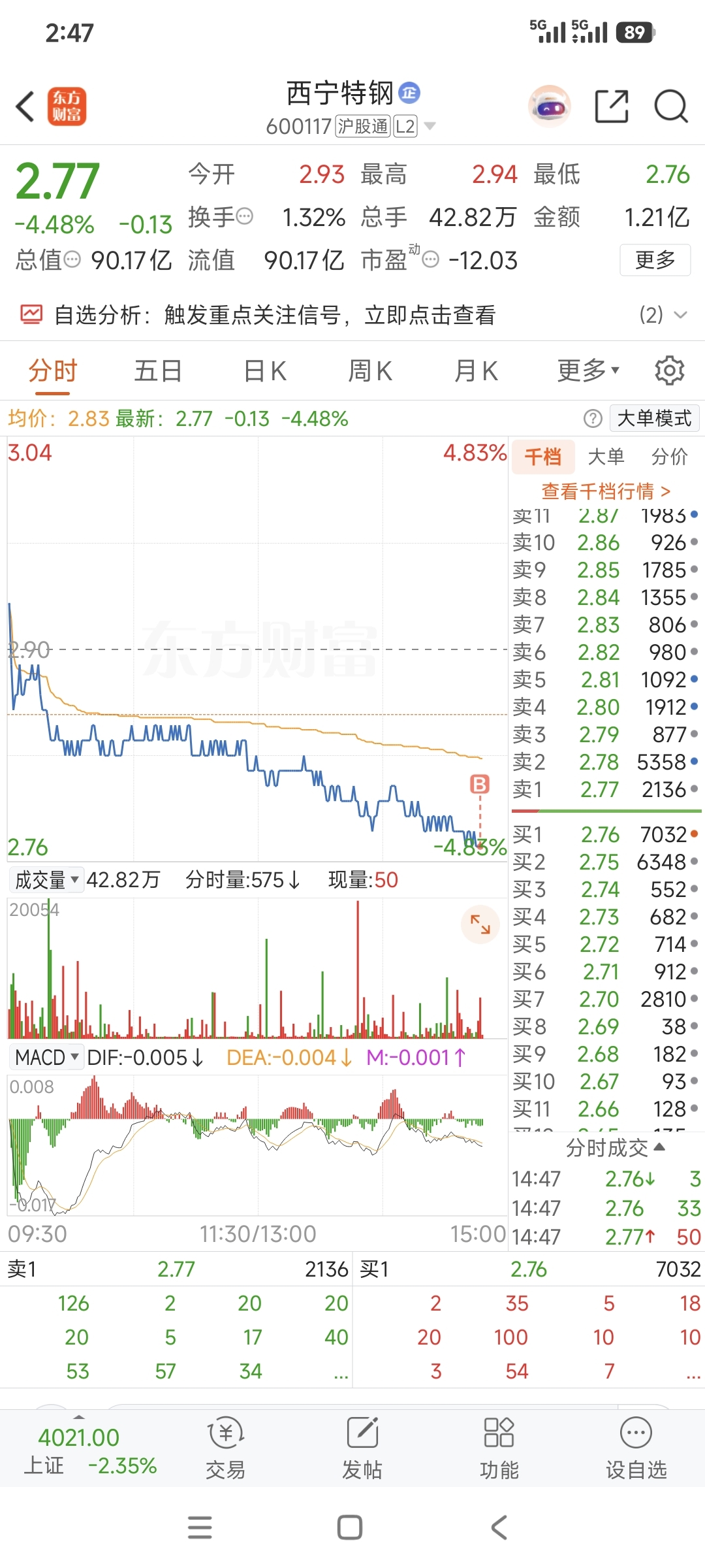 $西宁特钢(SH600117)$ 留半仓明天要是破2.70再加