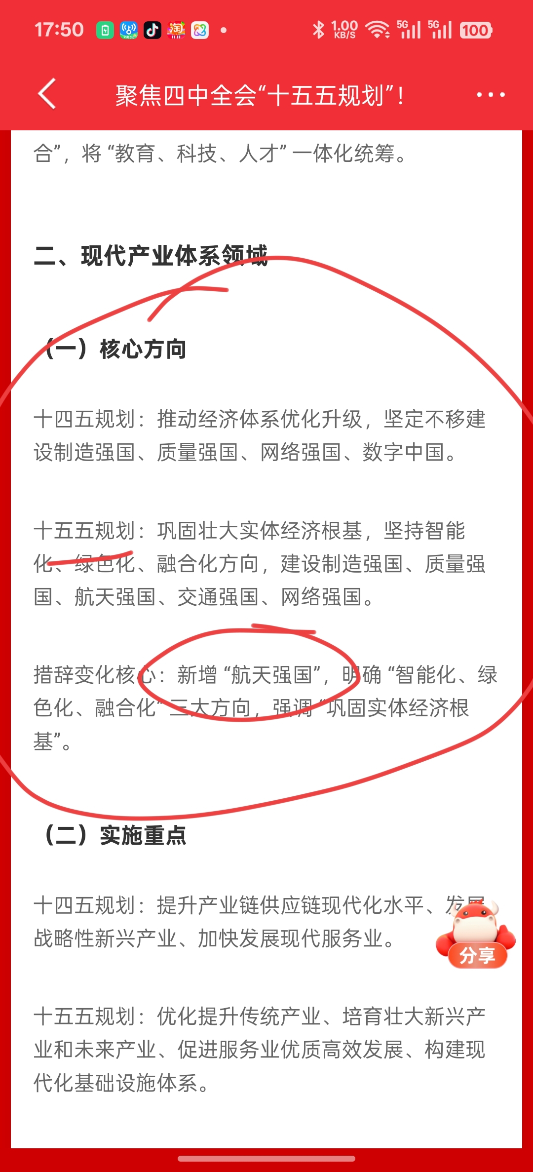 $中国卫星(SH600118)$ 相比于十四五规划,新增航天强国描述,说明这五年航空航天的重视程度提高十四五规划2020年以来,我们国家在这方面有所疏忽,直接落后美国马斯克一大截