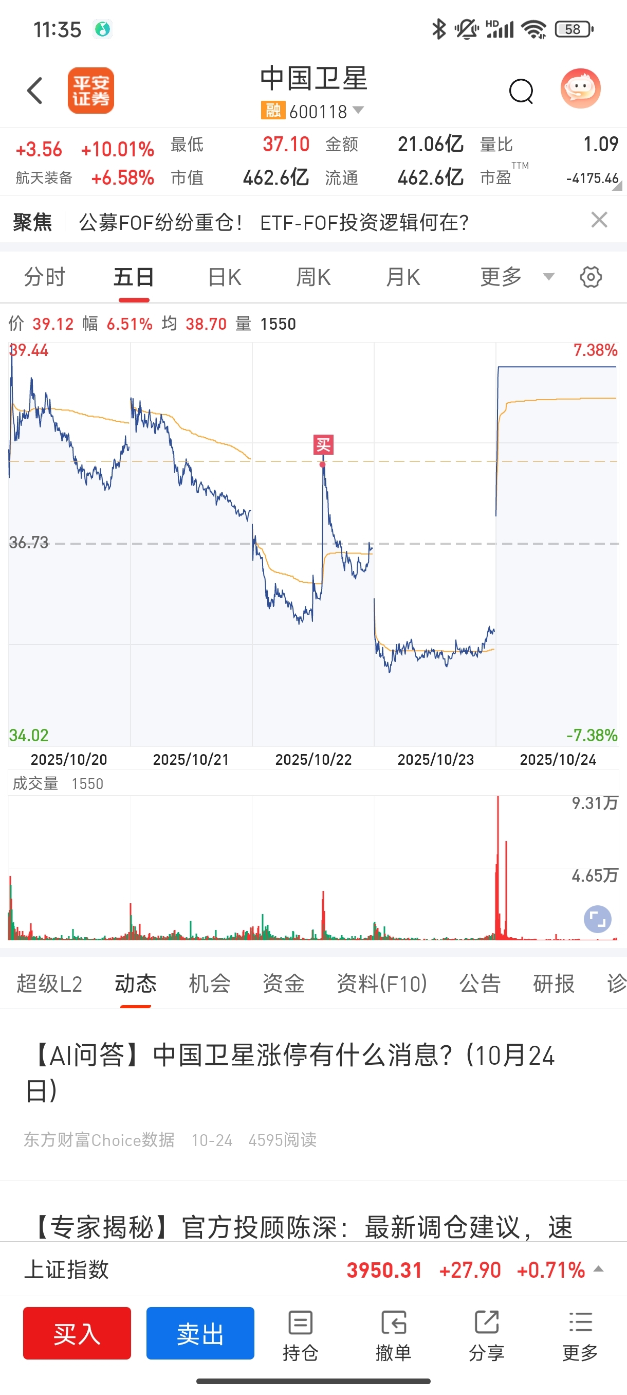 $中国卫星(SH600118)$ 有没有跟我一样,被周三拉那一下骗进来的?一买就挂顶上。这主力太狠了