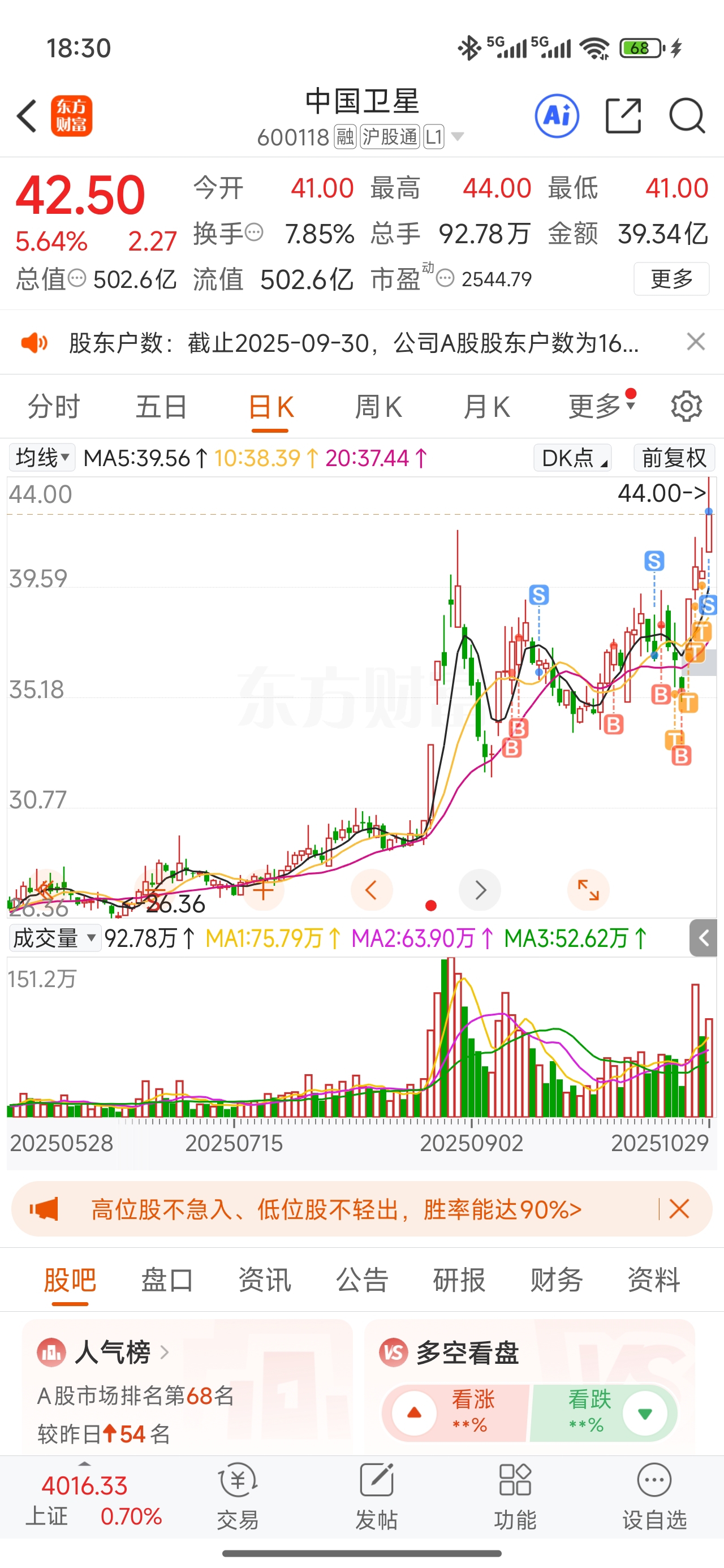 $中国卫星(SH600118)$ 丢了,等回调再买回来。长期看好卫星