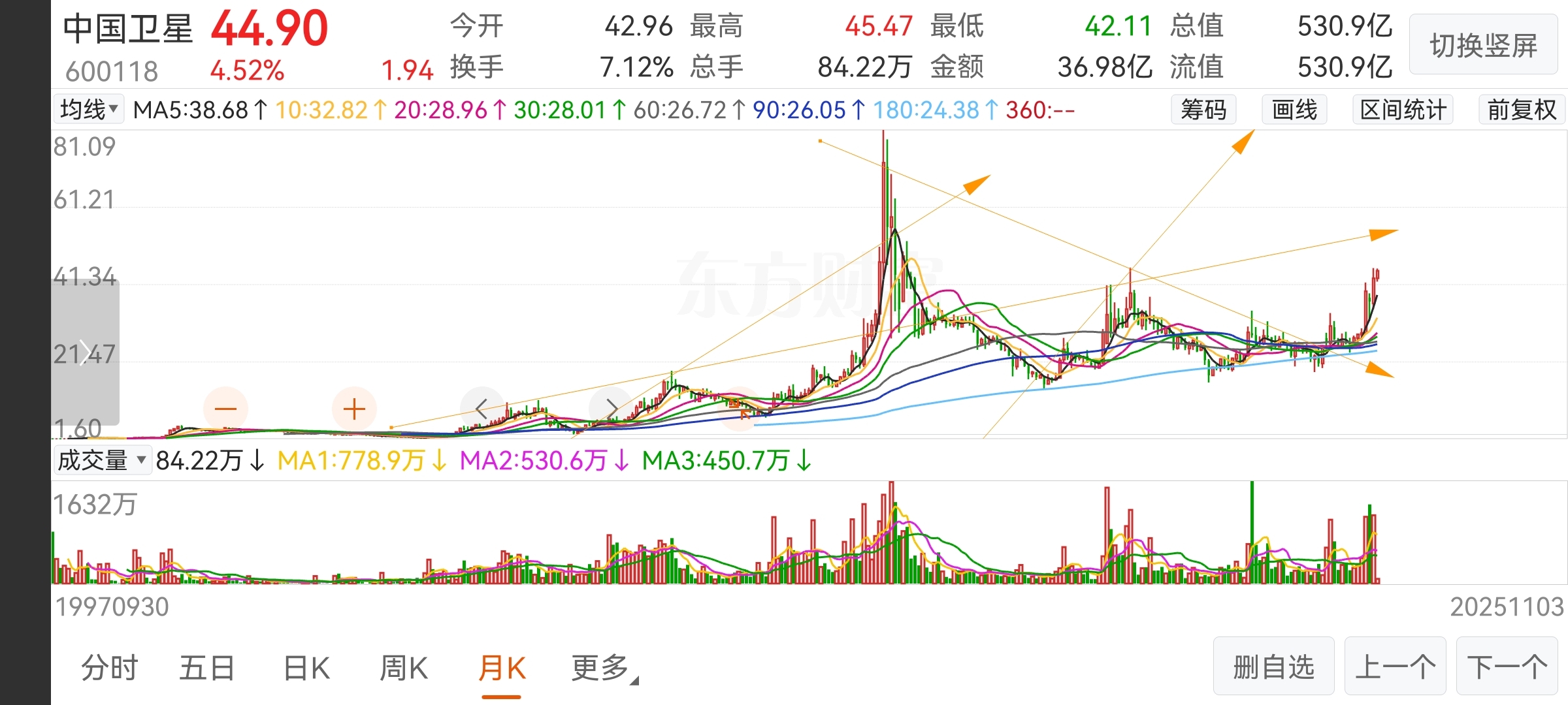 $中国卫星(SH600118)$ 我这线画的怎么样?要冲刺了呀!