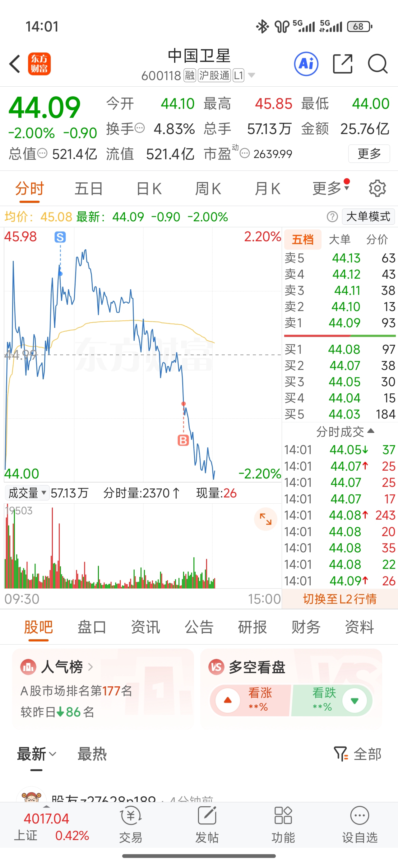 $中国卫星(SH600118)$ 接回来早了。股性真的差