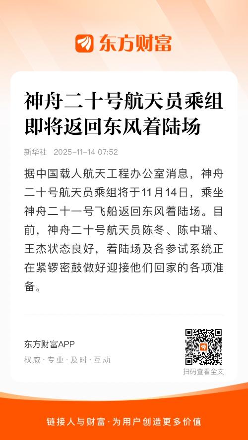 据中国载人航天工程办公室消息,神舟二十号航天员乘组将于11月14日,乘坐神舟二十一号飞船返回东风着陆场。目前,神舟二十号航天员陈冬、陈中瑞、王杰状态良好,着陆场及各参试系统正在紧锣密鼓做好迎接他们回家的各项准备。