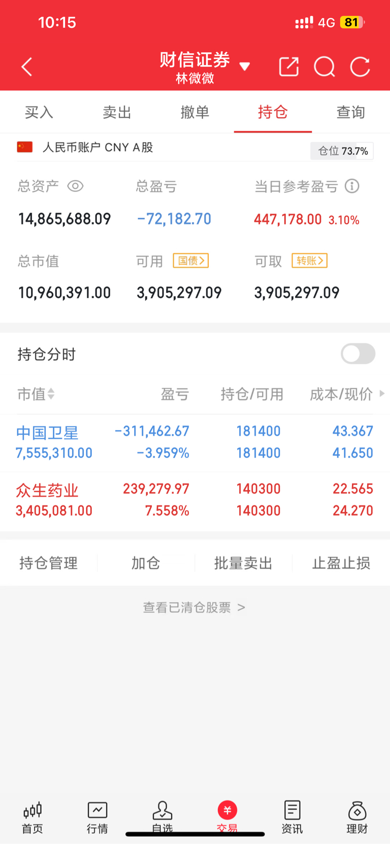 继续持有 $中国卫星(SH600118)$ $众生药业(SZ002317)$ 这支具备增长潜力,我满怀期待,相信随着后续市场的发展,达成盈利目标。