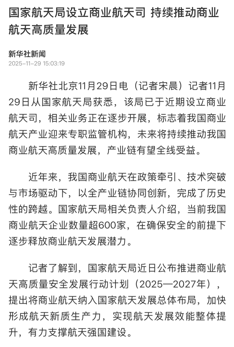 15点新华社重磅发布商业航天