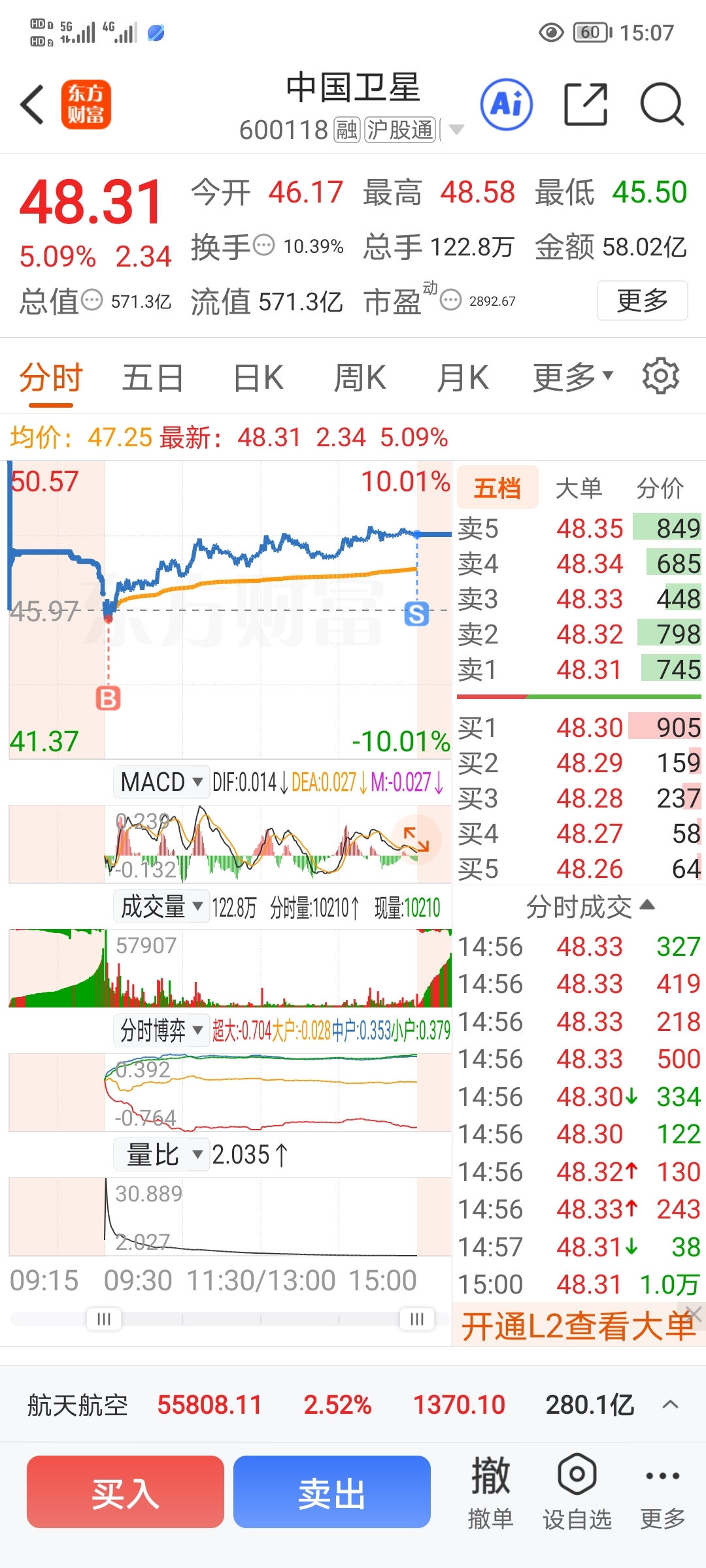 $中国卫星(SH600118)$ 不达预期,尾盘出来了,不智对与错