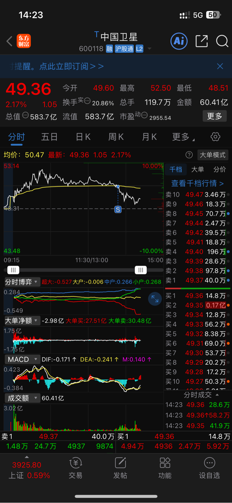 $中国卫星(SH600118)$ 不好意思了兄弟们 今天板块拉爆了都没拉板 明天要绿 先撤了 短期见顶了