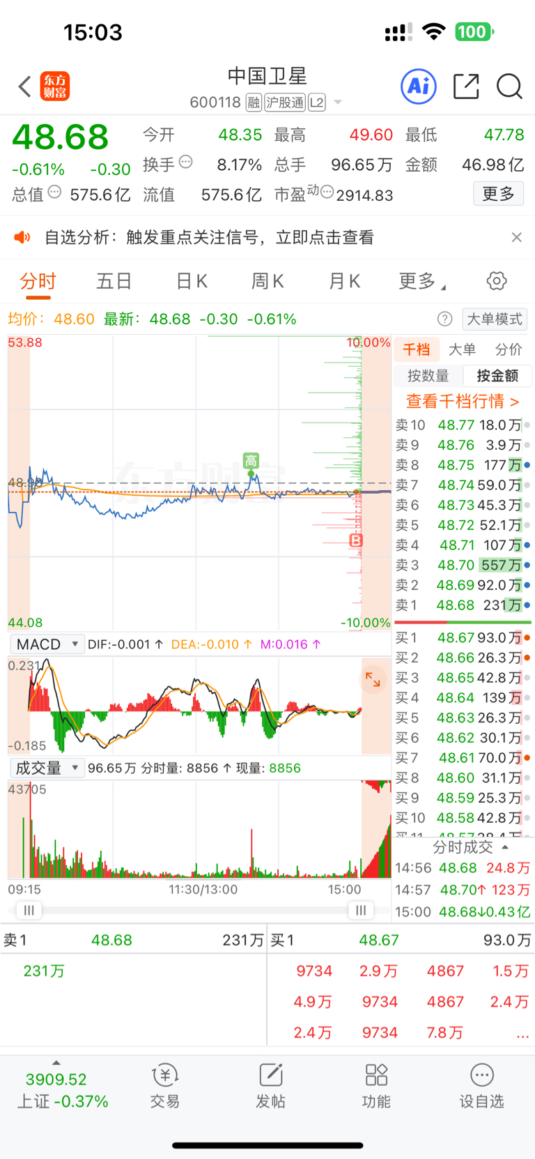 $中国卫星(SH600118)$ 56分尾盘买入中国卫星。