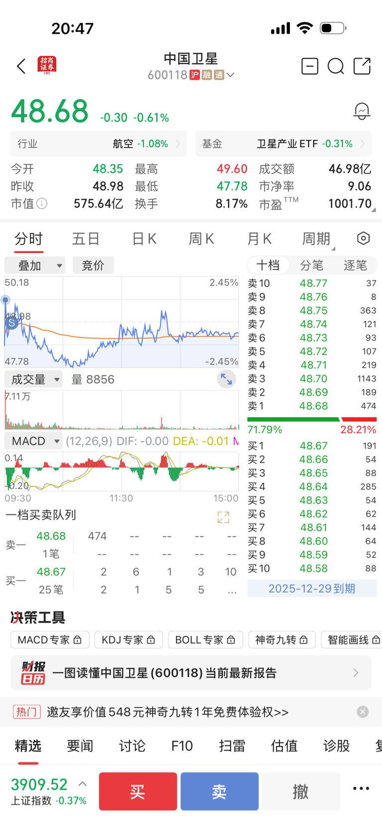 $中国卫星(SH600118)$ 早上跑了。这段时间会不会卖飞了,好慌啊