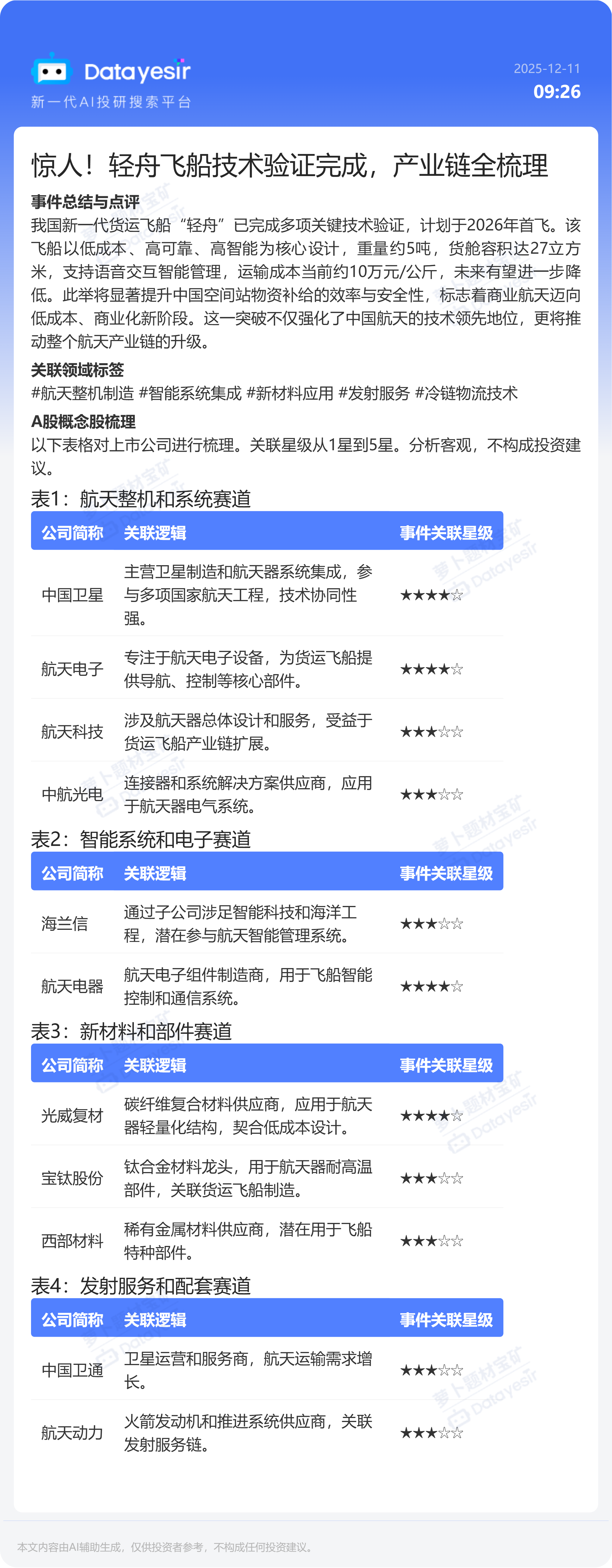 惊人!轻舟飞船技术验证完成,产业链全梳理