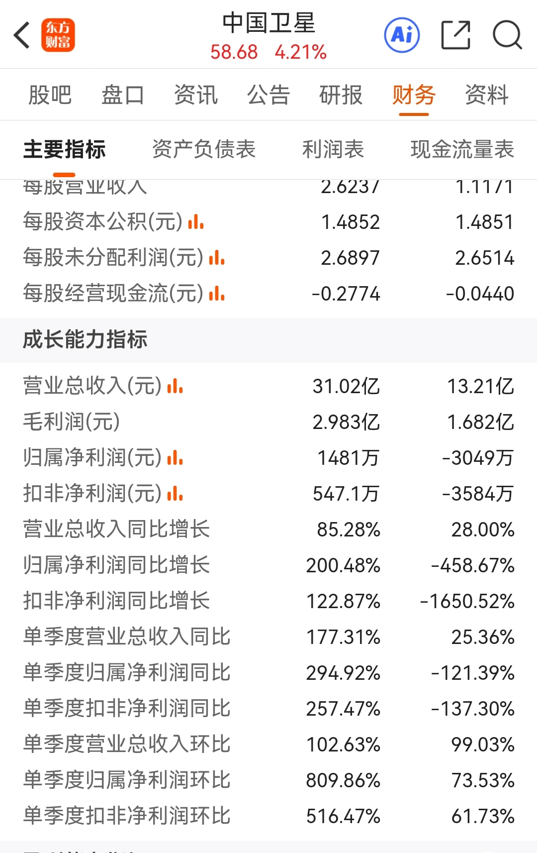 $中国卫星(SH600118)$ 看看中国卫星三季报同比,环比增长多少倍