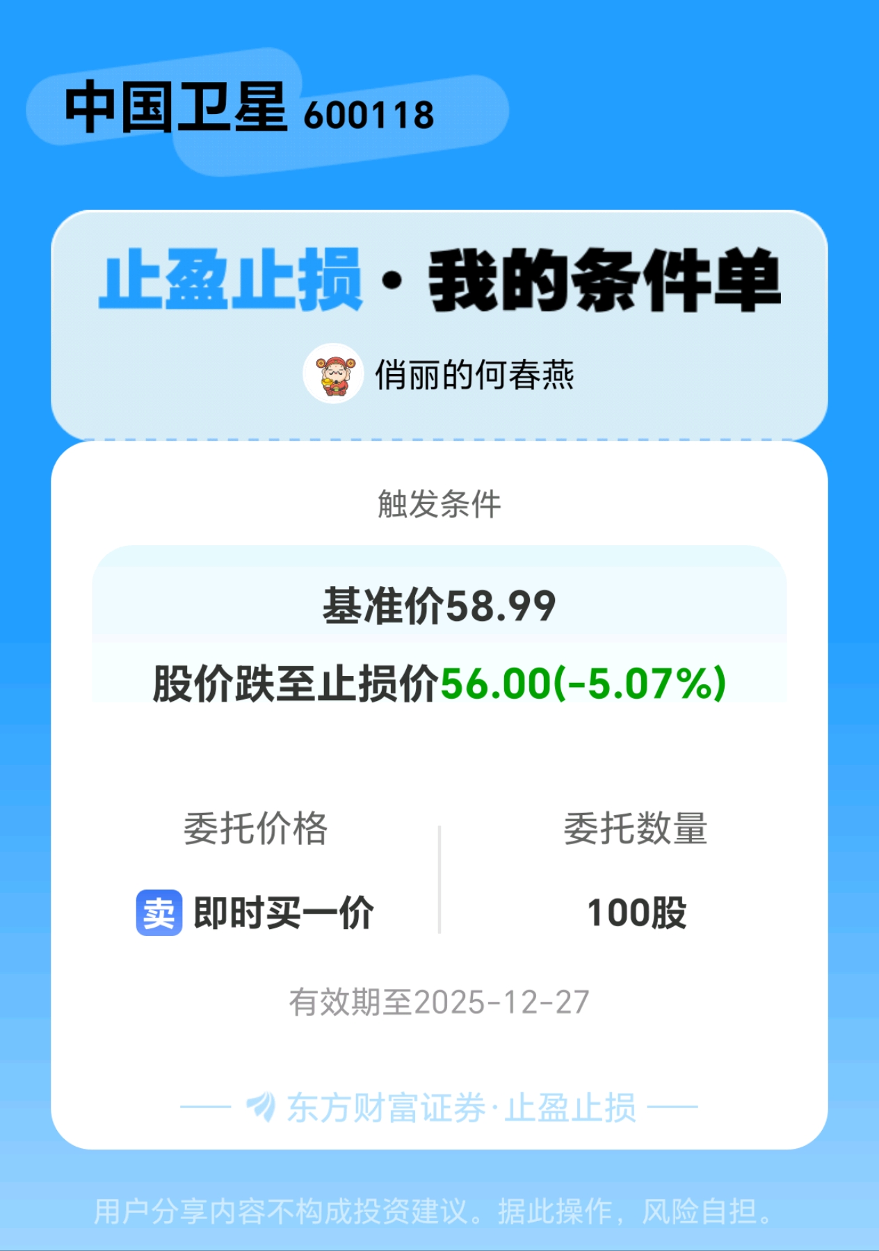 #条件单交流# #止盈止损晒单# 一位股神设置了一个止盈止损条件单,接下来就是见证奇迹的时刻~$中国卫星(SH600118)$