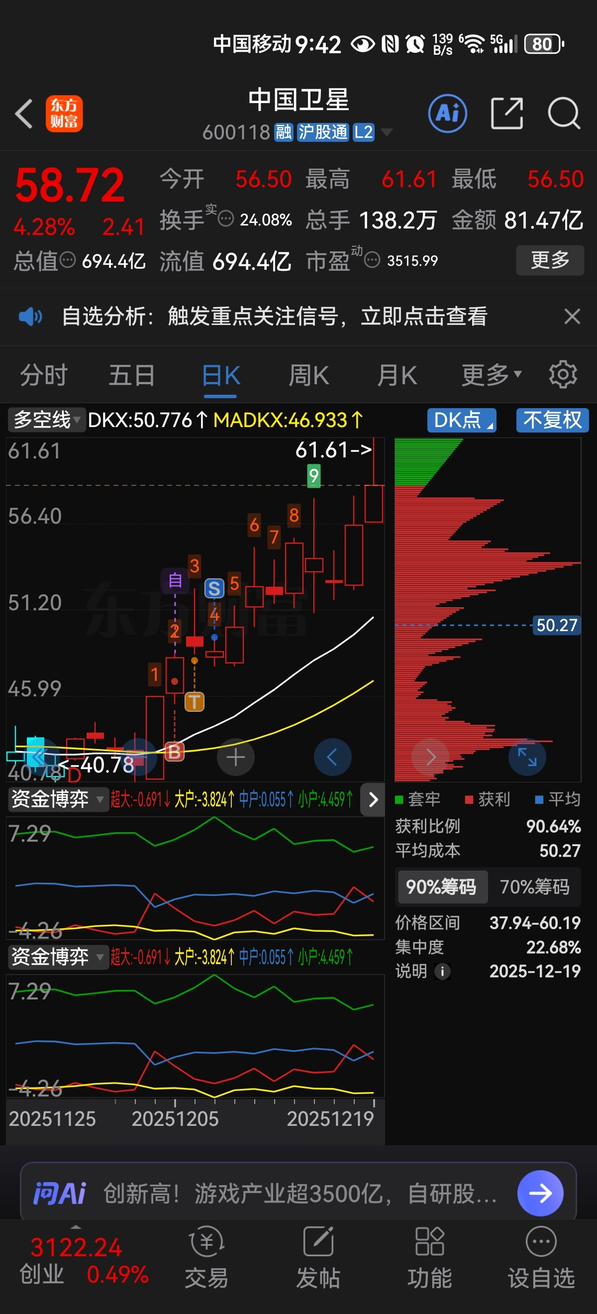 买到好票总是拿不住,中国卫星赚了2个点洗走了这回买3个航天发展,航天电子,航天智
