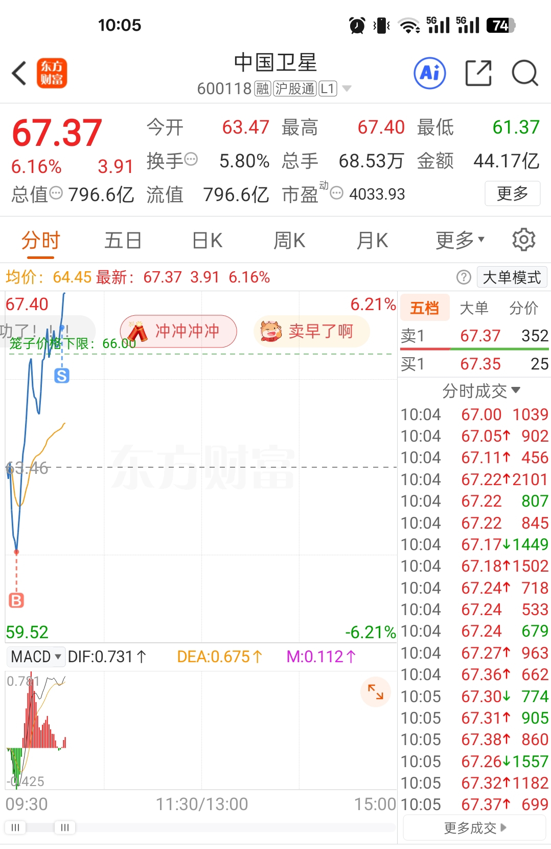 $中国卫星(SH600118)$ 真的会有人67以上进的吗?这票每次拉高必跳的。
