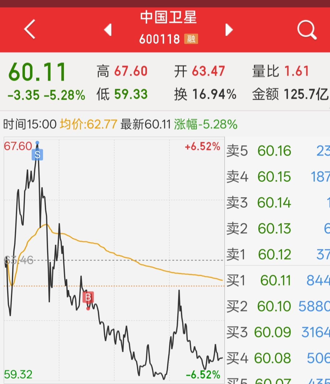 $中国卫星(SH600118)$ 心都碎了,早上67.5卖了一半,手贱61.8又接回来了,收盘还亏钱