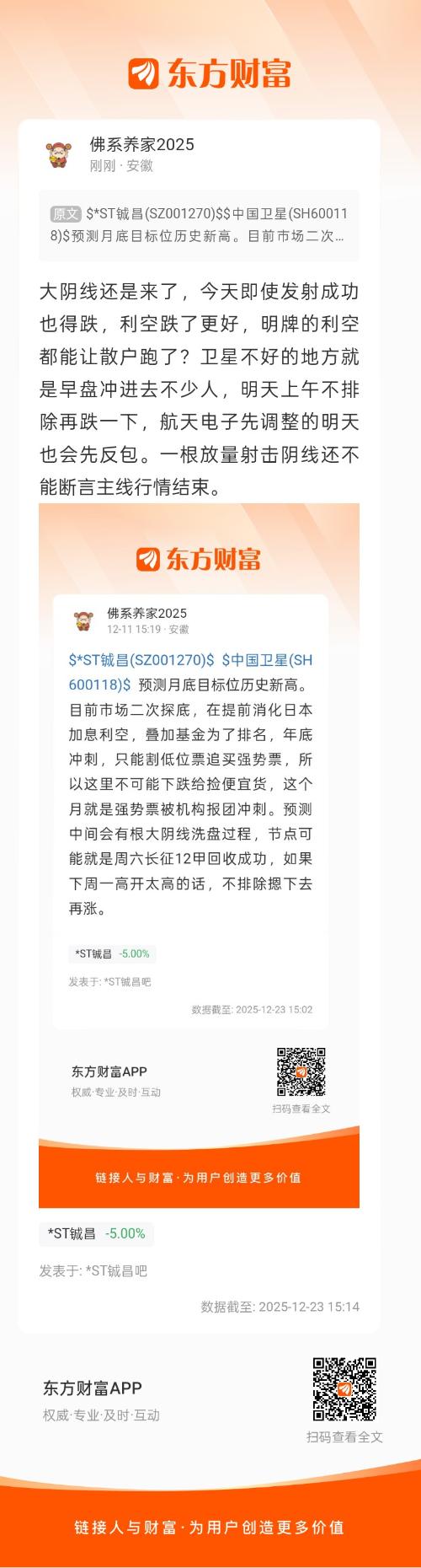 $中国卫星(SH600118)$//@佛系养家2025 :大阴线还是来了,今天即使发射成功也得跌,利空跌了更好,明牌的利空都能让散户跑了?卫星不好的地方就是早盘冲进去不少人,明天上午不排除再跌一下,航天电子先调整的明天也会先反包。一根放量射击阴线还不能断言主线行情结束。