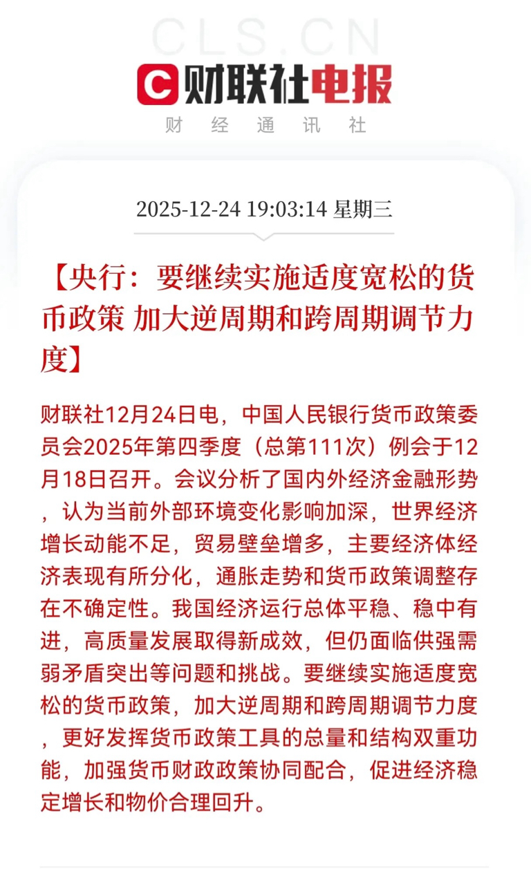 央行2025年四季度货币政策委员会例会释放明确信号,继续实施适度宽松的货币政策并加大逆周期、跨周期调节力度,这一导向对资本市场而言,是兼具稳预期与拓空间的关键利好。