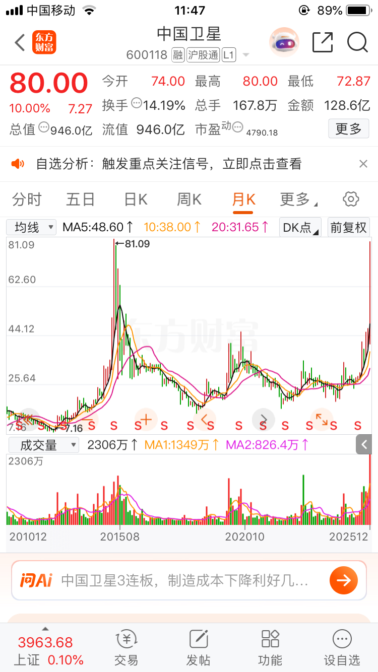 $中国卫星(SH600118)$ 早上好!各位股神。假消息满天飞,传说科创板的商业航天龙头公司被立案调查,这种传言,下周一是否会影响中国卫星三连板的顺势冲高溢价,大家一起来猜一猜,能否刷新历史制高点81.09元,现在80元整。能不能刷新,表个态,还是开盘竞价一字板跌停出逃,关门打犭 句。