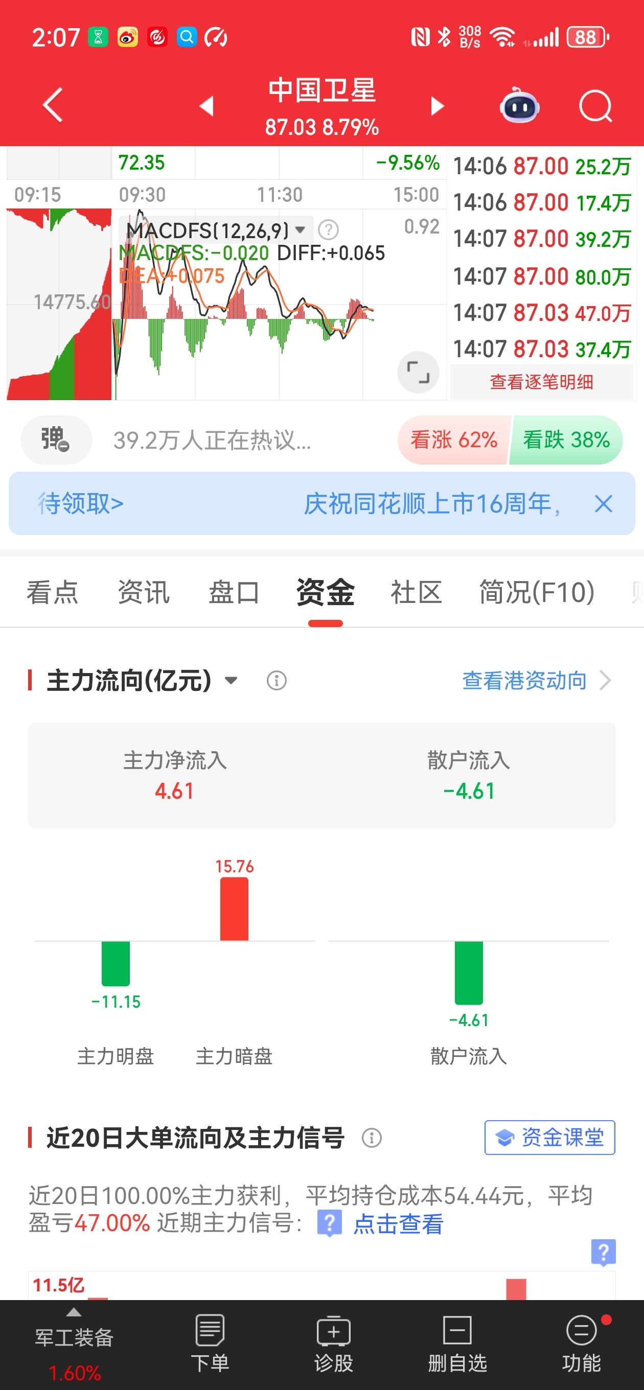 $中国卫星(SH600118)$ 有人问主力流出11个亿被谁接了那么好这张图一看就知道了。当然这个图只是一个借鉴市值到1000多亿不是散户能接的住的