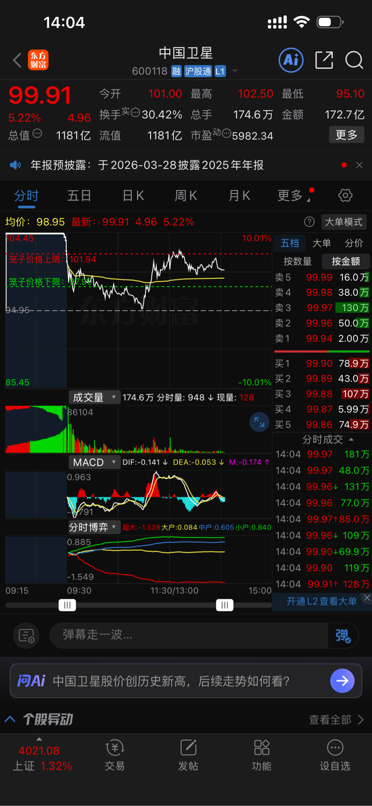 $中国卫星(SH600118)$ A股市盈率最高的公司6000倍啊。散户别追了。泡沫太大了!