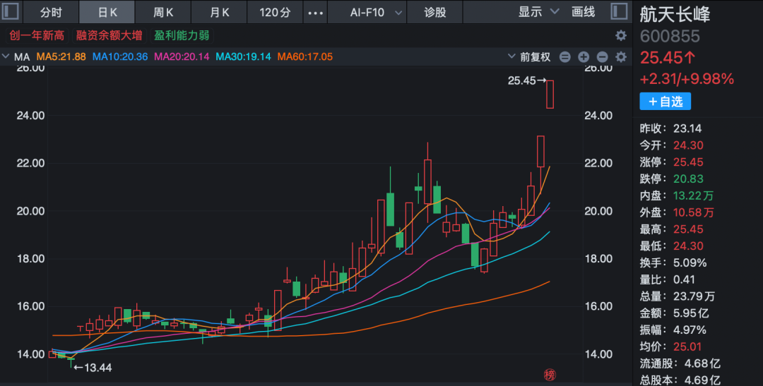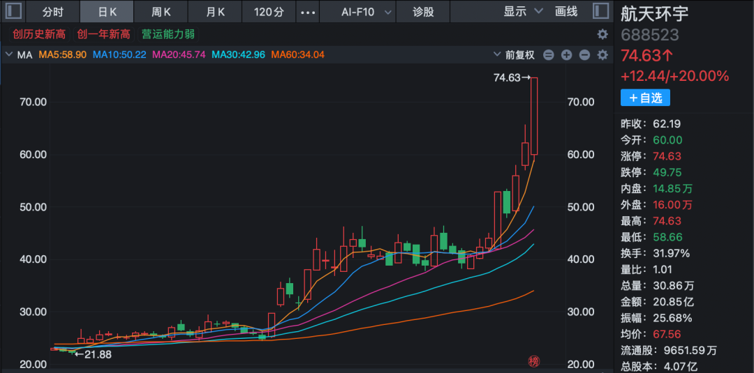 航天环宇借助本轮行情,股价也创出历史新高,最新报收74.63元/股,市值304亿元。公司表示,目前日常经营情况正常,未发生重大变化,当前股价已严重脱离基本面。投资者交易存在较大风险。
